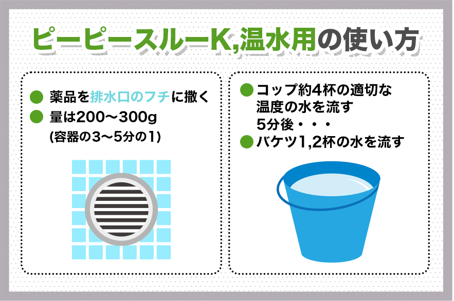 まいた薬品の周りから、ピーピースルーKには水を、ピーピースルー温水用には約40℃の温水を600〜900ml (コップ4,5杯)流し込みます。